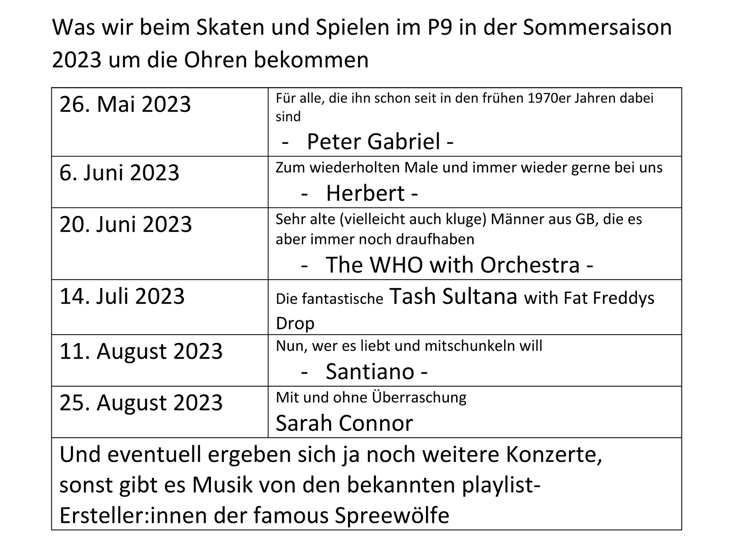 Nach Ostern konnten wir mit den Freizeit-Kursen wieder nach Charlottenburg umziehen, in das P09. Hier erwartetet uns eine wunderbar große Fläche mit gutem "Grip", toller Musikanlage und einem wunderschönen Blick ins Grüne. Wie jedes Jahr können wir in der Konzertsaison der Waldbühne quasi live dabei sein und hören auf der Fläche mit, was nebenan gespielt wird. Wen es interessiert, was läuft, findet hier eine Übersicht, die Spreewolf Holger uns jedes Jahr zusammenstellt. Wir freuen uns auf einen schönen gemeinsamen Sommer.