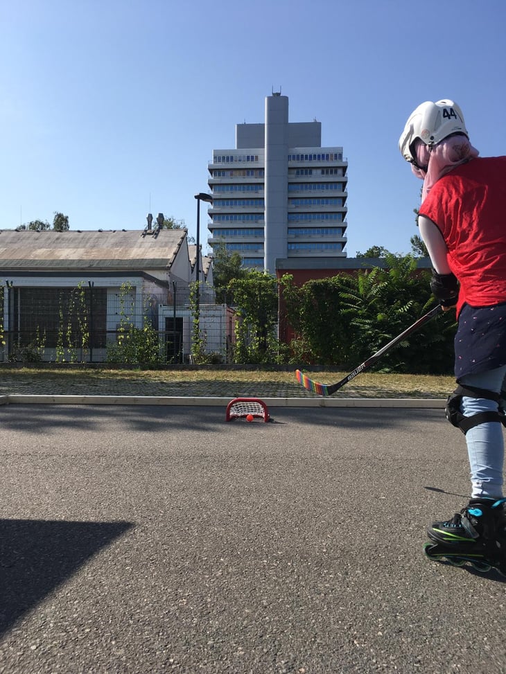 Am Montag früh rollten 24 SchülerInnen der Tesla-Grundschule über die Fläche. Teilweise standen die 3.-Klässler*innen zum ersten Mal auf Inlineskates, meisterten die Aufgabe aber bravourös. Zwei Tage später war dann die 5. Klasse an der Reihe. Beiden Schulklassen zeigten wir die Grundlagen des sicheren Skatens – vom Hinfallen bis zum Bremsen und Springen. Zum Abschluss durften alle wählen, ob sie weiter Inlineskaten oder ob sie sich beim gemeinsamen Hockeyspiel messen wollen.