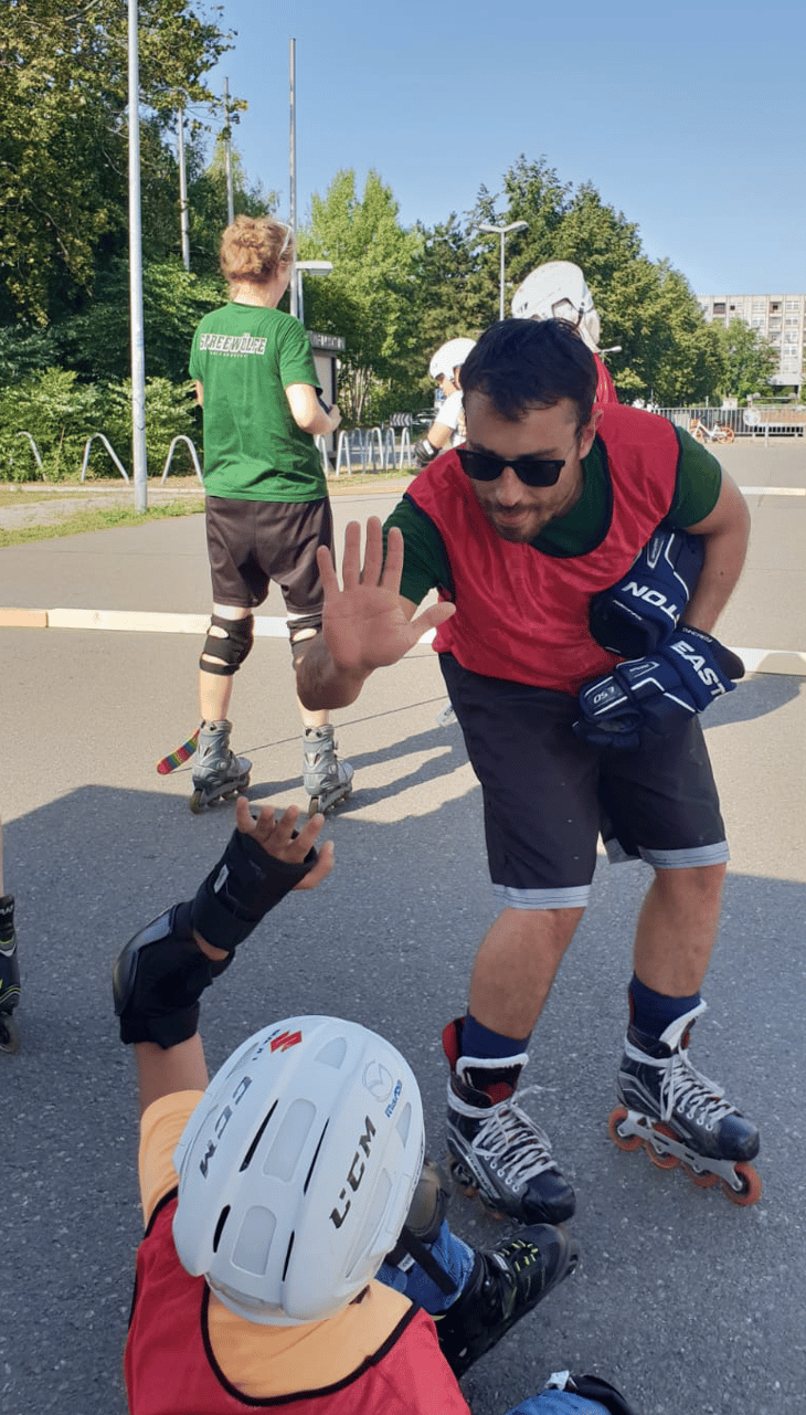 In Reinickendorf angekommen, steckten wir zuerst eine passende Fläche zum Skaten ab. Kurz danach kamen die Kinder in Begleitung der Leiterin des Tempohomes. Fast alle standen zum ersten Mal auf der Rolle, sind oft hingefallen, aber noch öfter wieder aufgestanden und haben die Aufgabe bravourös gemeistert. Auch uns hat es großen Spaß gemacht, die Kinder bei den ersten Schritten auf Inlineskates zu begleiten. Und wir waren beeindruckt, wie sogar die Kleinsten trotz Müdigkeit immer wieder aufgestanden und weitergerollt sind. Ein besonderer Dank gilt dem Team von BENN Wittenau-Süd, das uns in der Vorbereitung hervorragend unterstützt und begleitet hat. Der Tag bleibt uns in schöner Erinnerung und wir freuen uns, euch wieder besuchen zu dürfen!