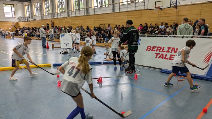 Die Initiative "Berlin hat Talent" veranstaltete am Samstag für die talentiertesten Schüler*innen des Bezirks Mitte die sogenannte Talentiade. An unterschiedlichen Ständen konnten die Kinder dabei neue Sportarten ausprobieren und verschiedene Vereine kennenlernen. Beim Skaterhockey erhielten sie von Ayoub, Mathis und Valerie eine Kurzeinführung ins Stickhandling und den gezielten Torschuss. Wer Lust auf mehr hatte, wurde zum Schnuppertraining eingeladen. Und wer weiß, vielleicht seht ihr...
